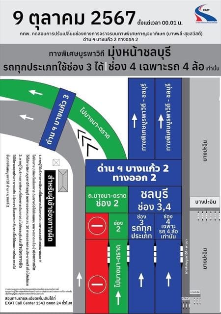 การทางพิเศษแห่งประเทศไทย (กทพ.) กระทรวงคมนาคม จะทดสอบการปรับเปลี่ยนช่ องทางการจราจร บนทางพิเศษกาญจนาภิเษก (บางพลี-สุขสวัสดิ์) ทิศทางจากพระราม 2 มุ่งหน้าไปทางพิเศษบูรพาวิถี บางนา ชลบุรี เพื่อลดการตัดกระแสการจราจรบริ เวณหน้า – หลัง ด่าน ฯ บางแก้ว 2 ทางออก 2 โดยช่องทางที่ 3 จะใช้สำหรับรถทุกประเภท และช่องทางที่ 4 เฉพาะรถ 4 ล้อเท่านั้น เริ่มตั้งแต่วันที่ 9 ตุลาคม 2567 เวลา 0.01 น. เป็นต้นไป