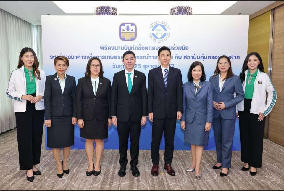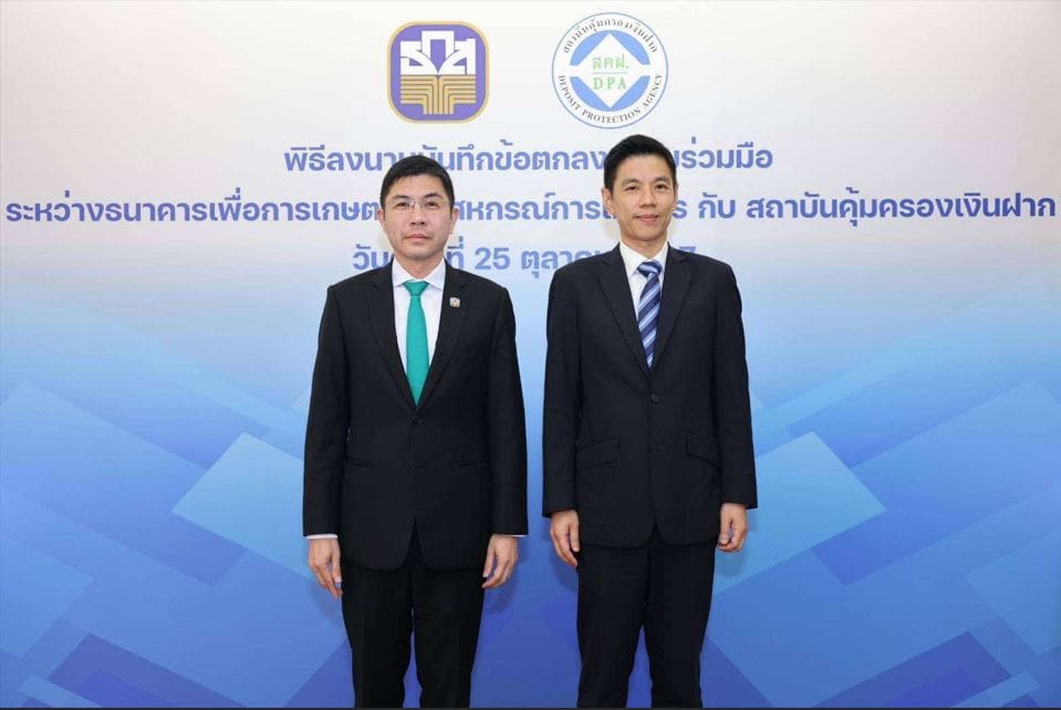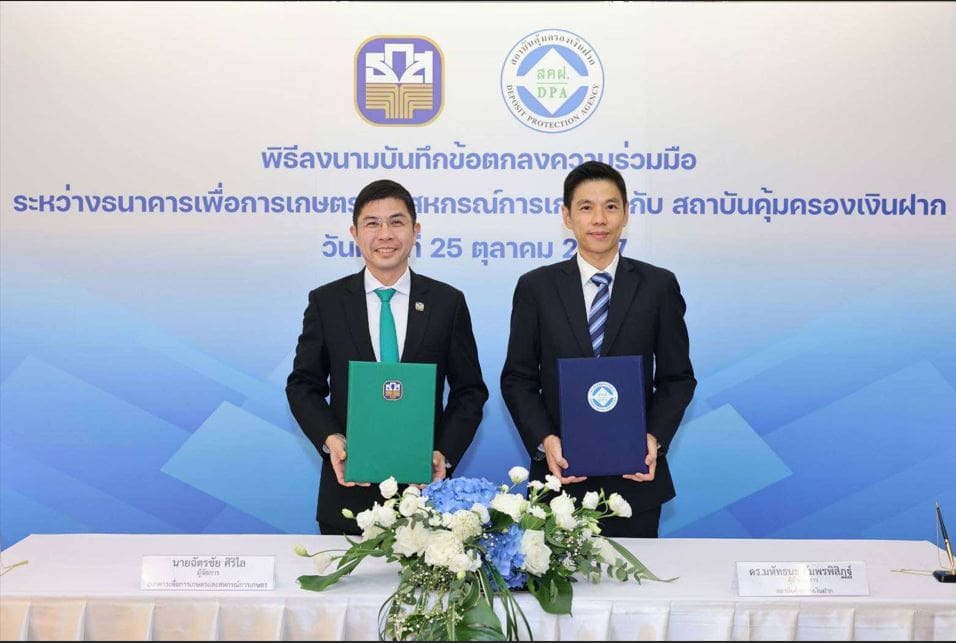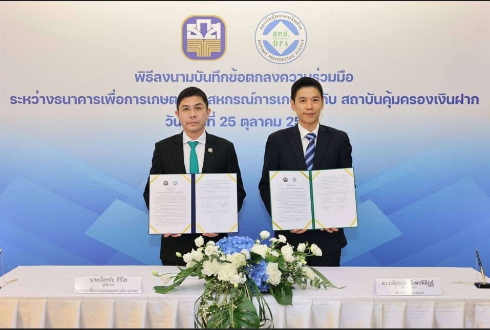 นายฉัตรชัย ศิริไล ผู้จัดการธนาคารเพื่อการเกษตรและสหกรณ์การเกษตร (ธ.ก.ส.) และ ดร. มหัทธนะ อัมพรพิสิฏฐ์ ผู้อำนวยการสถาบันคุ้มครองเงินฝาก (สคฝ.) ร่วมลงนามบันทึกข้อตกลงความร่วมมือสนับสนุนการให้ความรู้เกี่ยวกับการคุ้มครองเงินฝากแก่ประชาชนและการเตรียมความพร้อมในการจ่ายเงินฝากให้แก่ผู้ฝาก ระหว่าง ธ.ก.ส. และ สถาบันคุ้มครองเงินฝากเพื่อยกระดับความรู้ด้านการคุ้มครองเงินฝากให้กับกลุ่มเป้าหมายได้แก่ ลูกค้าธนาคาร เกษตรกร และประชาชนด้วยการเผยแพร่ข้อมูลผ่านช่องทางและวิธีการที่เหมาะสม เพิ่มขีดความสามารถในการเข้าถึงกลุ่มเป้าหมายรวมถึงการเตรียมความพร้อมในการจ่ายคืนเงินฝากให้แก่ผู้ฝากเงิน โดย ธ.ก.ส. จะสนับสนุนการรับการยื่นคำขอต่างๆและจ่ายคืนเงินฝากให้แก่ผู้ฝากให้สะดวก รวดเร็วมากยิ่งขึ้น โดยมีนางสาวพรหมกร พรหมขัติแก้ว ผู้ช่วยผู้จัดการ ธ.ก.ส. และนางสาวปณาลี วิเศษสุวรรณ ผู้ช่วยผู้อำนวยการสายปฎิบัติการคุ้มครองเงินฝาก สคฝ. พร้อมผู้บริหารจากทั้งสองหน่วยงานร่วมในพิธี เมื่อวันที่ 25 ตุลาคม 2567 ณ ห้องวิภาวดี ชั้น 27 สถาบันคุ้มครองเงินฝาก กรุงเทพฯ