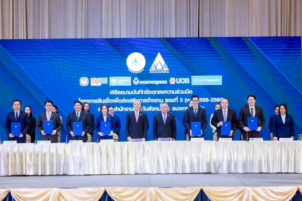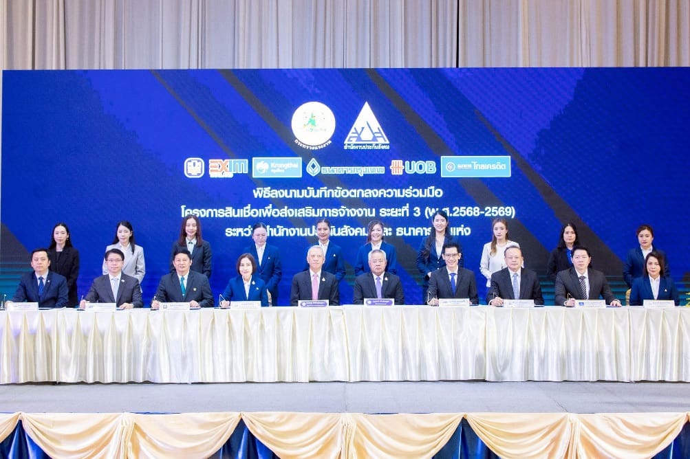 วันที่ 29 พฤษภาคม 2568 เวลา 13.30 น. นายพิพัฒน์ รัชกิจประการ รัฐมนตรีว่าการกระทรวงแรงงาน เป็นประธานและสักขีพยานในพิธีลงนามบันทึกข้อตกลงความร่วมมือในโครงการสินเชื่อเพื่อส่งเสริมการจ้างงาน ระยะที่ 3 (พ.ศ. 2568 – 2569) ระหว่างสำนักงานประกันสังคม ร่วมมือกับ ธนาคารเพื่อการเกษตรและสหกรณ์การเกษตร ธนาคารเพื่อการส่งออกและนำเข้าแห่งประเทศไทย ธนาคารกรุงไทย จำกัด (มหาชน) ธนาคารกรุงเทพ จำกัด (มหาชน) ธนาคารยูโอบี จำกัด (มหาชน) และธนาคารไทยเครดิต จำกัด (มหาชน) โดยมี นายบุญสงค์ ทัพชัยยุทธ์ ปลัดกระทรวงแรงงาน นางมารศรี ใจรังษี เลขาธิการสำนักงานประกันสังคม คณะกรรมการสำนักงานประกันสังคม คณะผู้บริหารกระทรวงแรงงาน คณะผู้บริหารธนาคารที่เข้าร่วมโครงการทั้ง 6 แห่ง ผู้แทนสภาหอการค้าแห่งประเทศไทย ผู้แทนสมาพันธ์เอสเอ็มอีไทย แขกผู้มีเกียรติ สื่อมวลชน และเจ้าหน้าที่สำนักงานประกันสังคม ให้การต้อนรับ ณ ห้องประชุมวายุภักษ์ แกรนด์บอลรูม ชั้น 4 โรงแรมเซ็นทารา ไลฟ์ ศูนย์ราชการและคอนเวนชันเซ็นเตอร์ แจ้งวัฒนะ กรุงเทพมหานคร