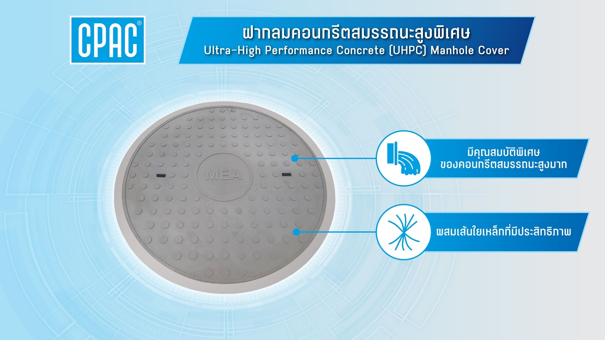 บริษัท ผลิตภัณฑ์และวัตถุก่อสร้าง จำกัด หรือ CPAC ในเครือเอสซีจี นำโดย คุณสุรชัย นิ่มละออ กรรมการผู้จัดการใหญ่ ธุรกิจเอสซีจี ซีเมนต์แอนด์กรีนโซลูชัน ในเอสซีจี ร่วมด้วย คุณวิลาศ เฉลยสัตย์ ผู้ว่าการการไฟฟ้านครหลวง ลงนามบันทึกข้อตกลง (MOU) ความร่วมมือด้านศึกษาและพัฒนาฝาท่อปิดระบบท่อร้อยสายไฟฟ้าในผิวจราจร (Manhole Cover & Manhole Frame) ด้วยการนำเทคโนโลยีคอนกรีตสมรรถนะสูงพิเศษ (Ultra-High Performance Concrete) มาทดแทนระบบฝาท่อเหล็กหล่อแบบเดิม