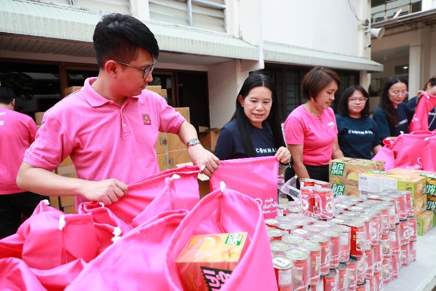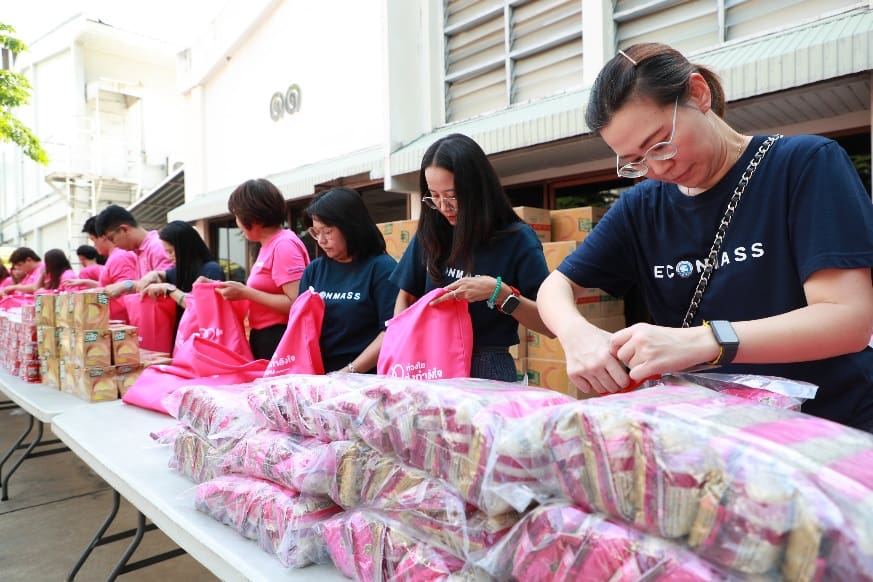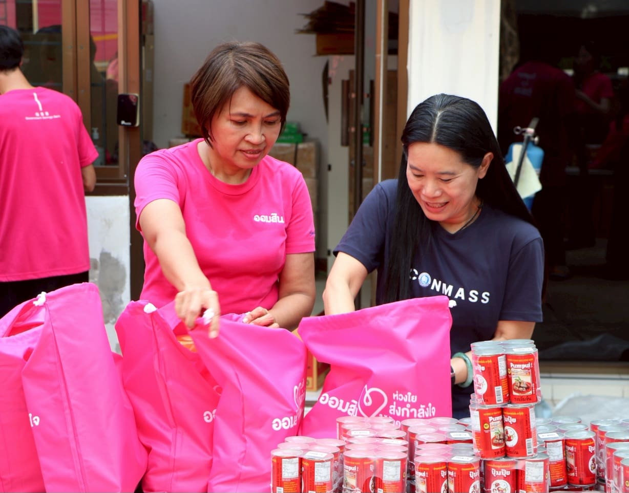 นางสุนันท์ธนา จันทร์พานิช ผู้อำนวยการฝ่ายส่งเสริมการออมและ CSR และนางสาวดวงพร อุดมทิพย์ นายกสมาคมผู้สื่อข่าวเศรษฐกิจ พร้อมด้วยผู้บริหาร พนักงานจิตอาสาธนาคารออมสิน และคณะกรรมการสมาคมฯ ร่วมแรงร่วมใจระดมกำลังบรรจุถุงยังชีพ จำนวน 2,000 ถุง อาทิ ข้าวสาร อาหารแห้ง บะหมี่กึ่งสำเร็จรูป ปลากระป๋อง น้ำดื่ม และสิ่งของจำเป็น